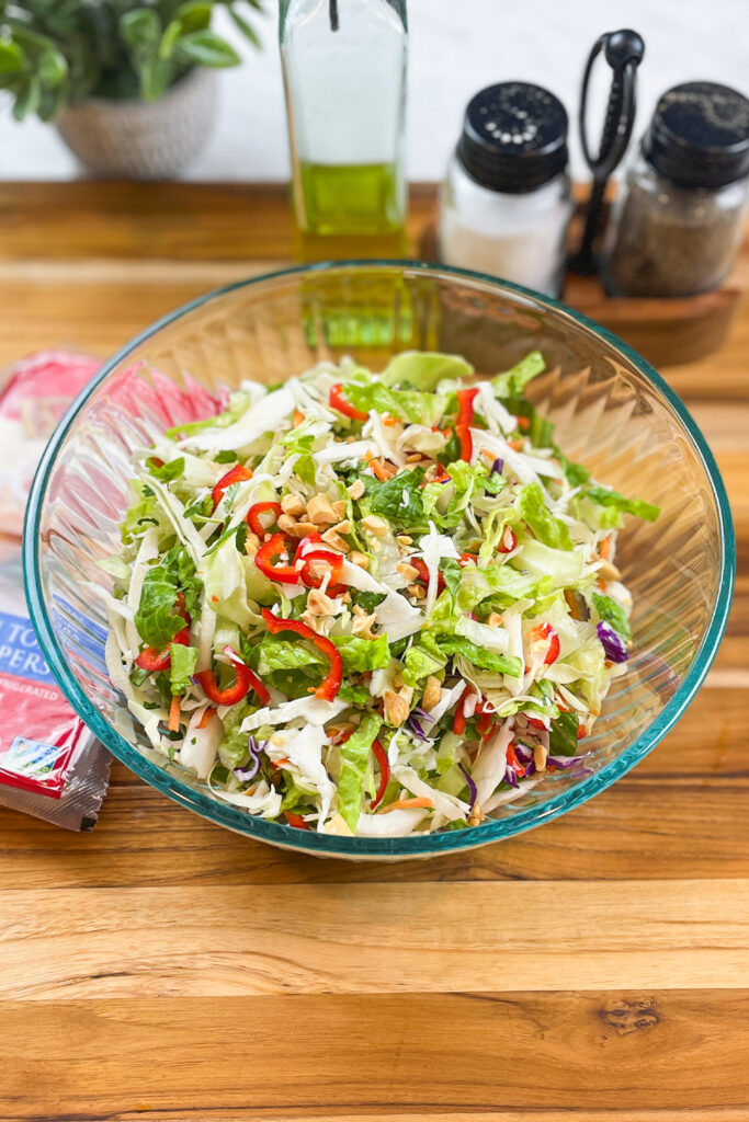 - In a large bowl, combine cabbage, romaine, carrots, bell peppers, green onions, cilantro, and peanuts.